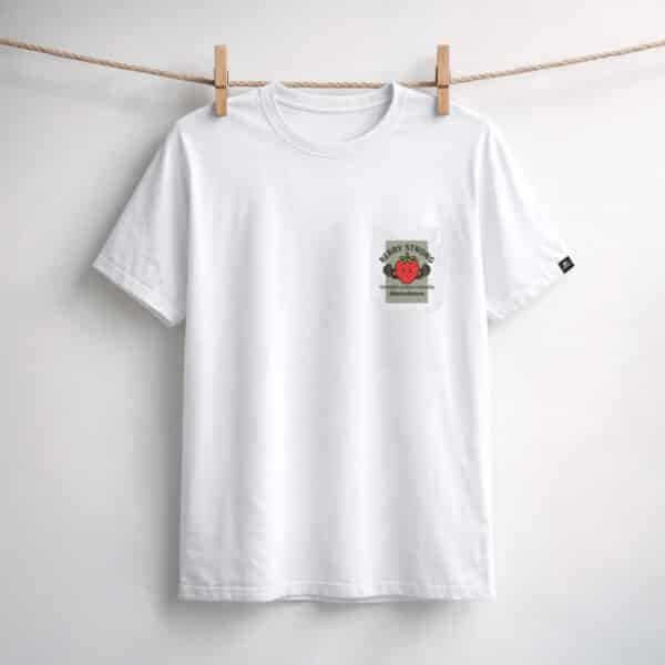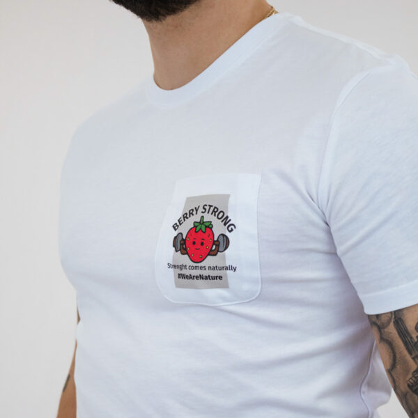 Una camiseta blanca con una impactante ilustración de una fresa levantando pesas y el texto en negrita “BERRY STRONG”.Con el lema “La fuerza surge de forma natural”, esta camiseta es una forma divertida y motivadora de mostrar tu poder natural.