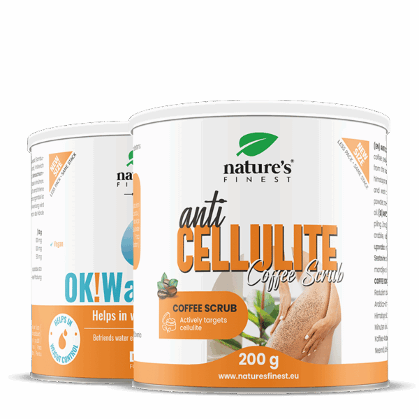 Cáscara de café anticelulítico: sal rosa del Himalaya, polvo de semilla de café arábica, aceite de cocos nucifera, aceite refinado de almendras, aceite de neem, aceite esencial de geranio. OK! WaterOut: sabor natural a piña, extracto de hoja de ortiga, extracto de saúco, edulcorante glucósido de esteviol.