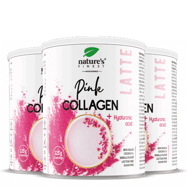 Pink Latte con colágeno, ácido hialurónico y asvaganda, ayudan a reemplazar el colágeno perdido, proporcionan una piel sana y más fexible, contribuyen al equilibrio emocional y la resistencia al estrés. Aporta energía