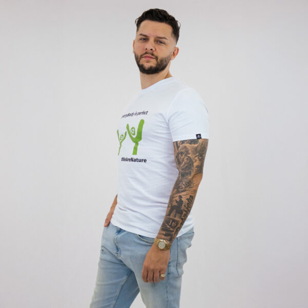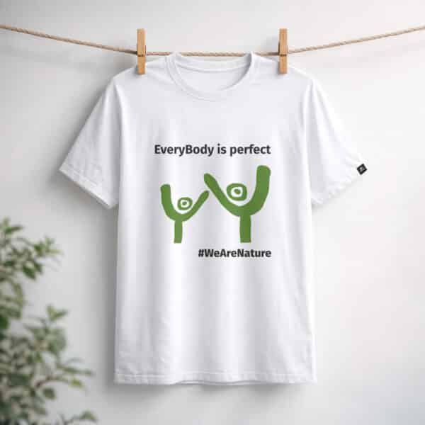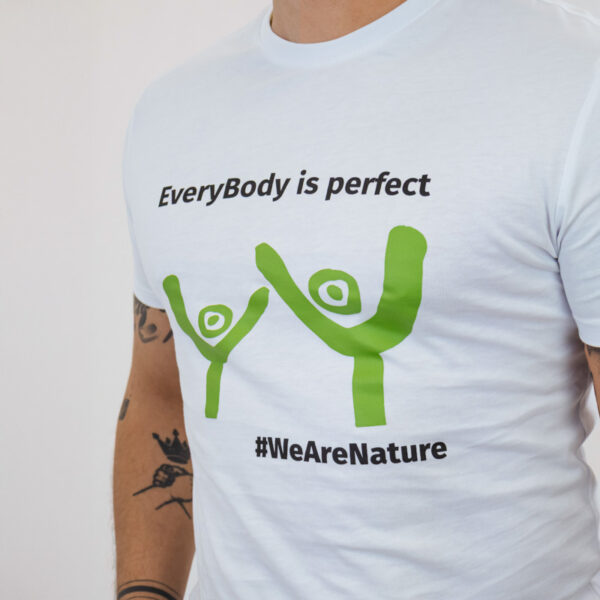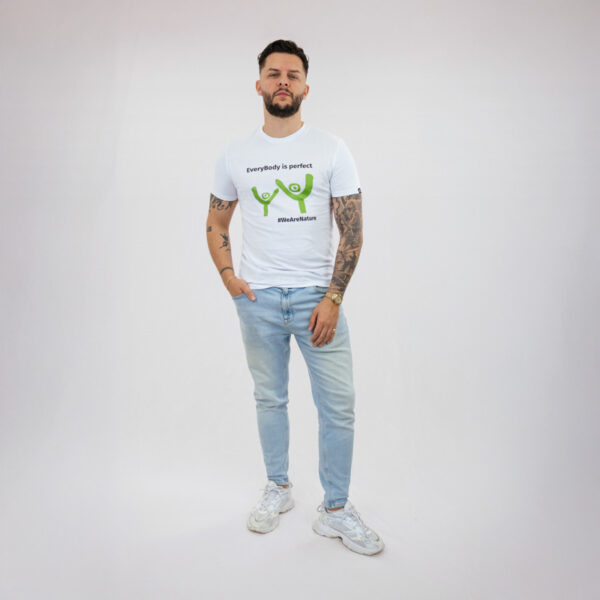 Una camiseta blanca con un gráfico llamativo y minimalista de dos figuras verdes con el mensaje “EveryBody is perfect.” Diseñada para hombres que valoran la confianza y la autenticidad, esta camiseta combina estilo con una sutil declaración sobre la autoaceptación.