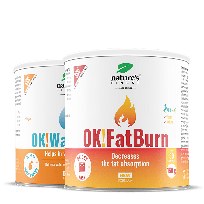 ¡OKFatBurn: Vitamina C, ID-alG ™, aroma natural a limón, L-carnitina, L-tirosina, colorante natural de remolacha, glucósidos de esteviol edulcorante. ¡OKWaterOut: Maltodextrina, estabilizante: celulosa, sabor a piña, extracto de hojas de ortiga (Urtica dioica), extracto de saúco (Sambucus nigra L.), concentrado de remolacha (maltodextrina, polvo de remolacha (Beta Vulgaris)), extracto de polygonum aviculare (Polygonum aviculare L.), edulcorante: glicósido de esteviol.