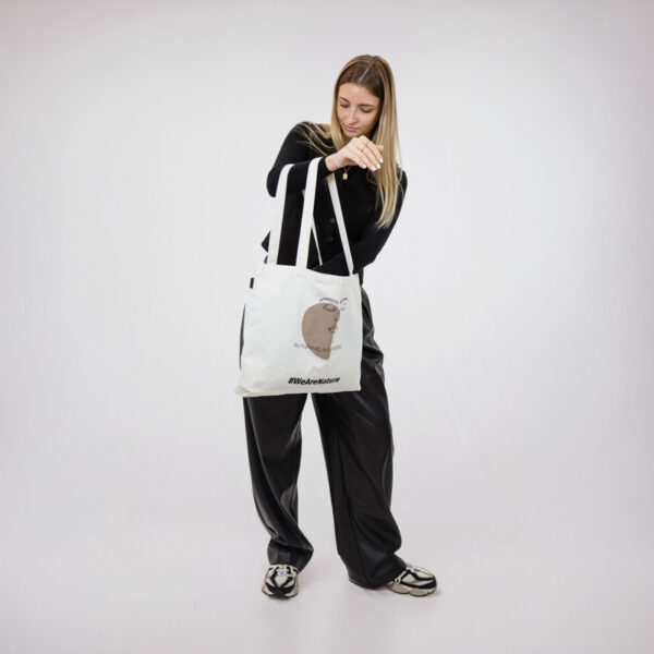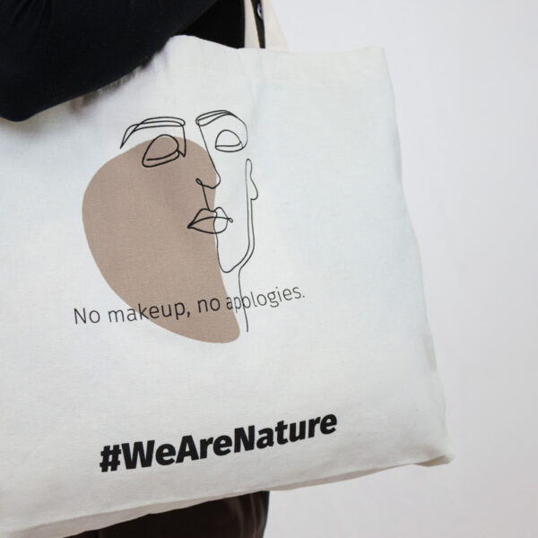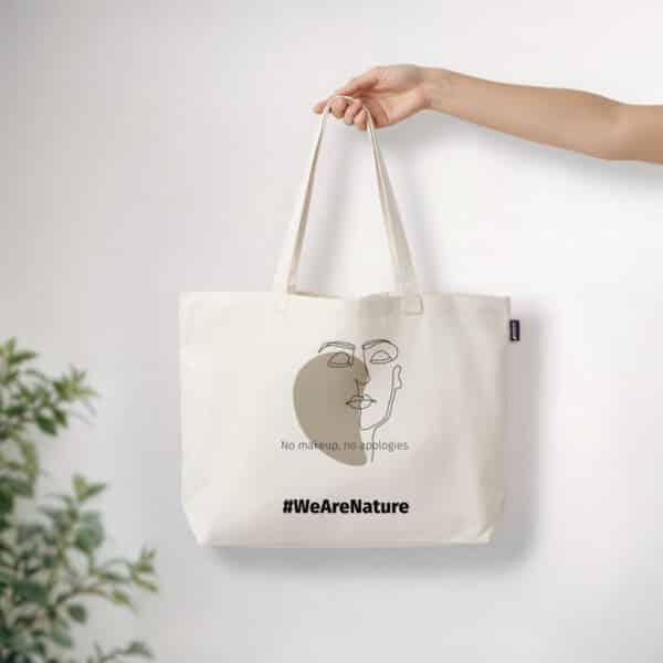 Un bolso tote atemporal que celebra la autenticidad y la autoexpresión. Con un dibujo lineal minimalista de un rostro sereno, luce con orgullo el mensaje “Sin maquillaje, sin disculpas”, animándonos a abrazar nuestro yo natural.