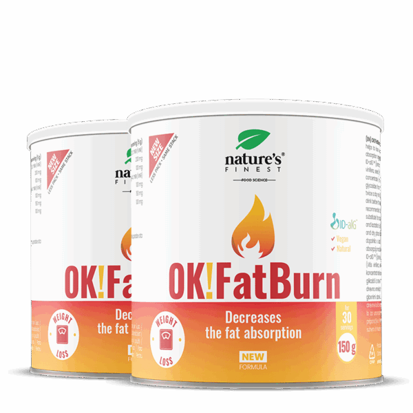 OK!Fatburn es una fórmula eficaz para perder peso que inhibe las enzimas que digieren carbohidratos y grasas gracias a ID-alG™. El efecto triple de la fórmula contribuye a un metabolismo normal que produce energía⁴, con el poder añadido de L-tirosina y L-carnitina. Los estudios confirman la pérdida de peso notable asociada con la reducción de la masa grasa.¹