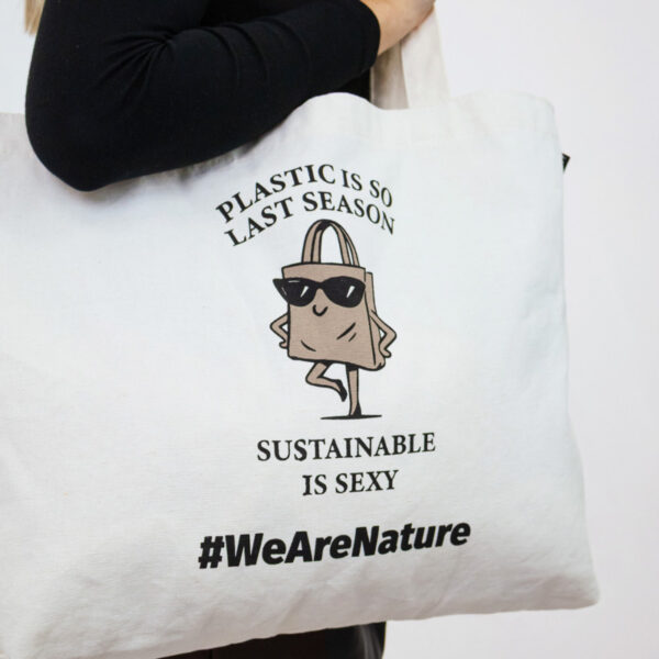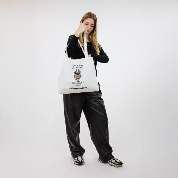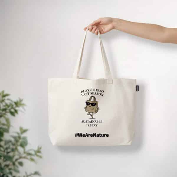 Un bolso tote atemporal diseñado para el estilo diario con un toque sostenible. Estampado con el divertido mensaje “El plástico es tan de la temporada pasada. Lo sostenible es sexy.” y una encantadora ilustración de una bolsa de la compra segura de sí misma con gafas de sol, aporta humor y actitud a una vida consciente.