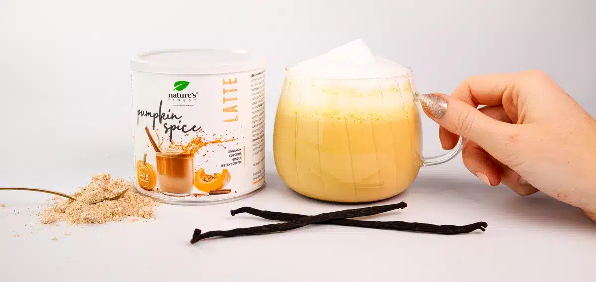 Ingredientes: bebida de arroz en polvo (arroz, betaglucanos de avena, aceite de girasol, sal), agave en polvo, edulcorante: eritritol, bebida de coco en polvo (crema de coco, maltodextrina de arroz), aroma de calabaza, café instantáneo (Coffea arabica L.), aroma de vainilla, canela en polvo (Cinnamomum zeylanicum, corteza), jengibre en polvo (Zingiber officinale, raíz), extracto de cúrcuma (Curcuma longa L., rizoma).