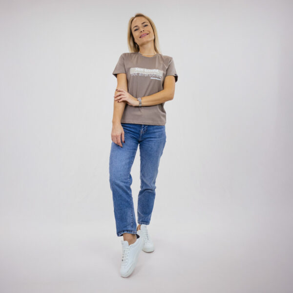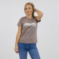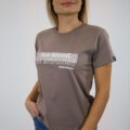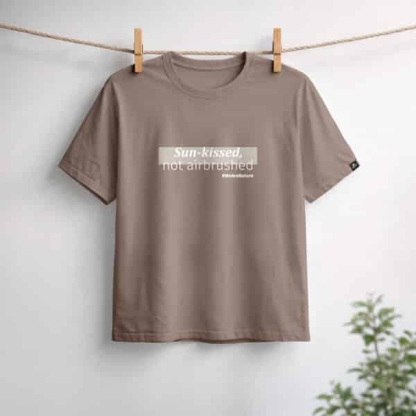 Una camiseta minimalista en color topo creada para un look diario naturalmente seguro. Con la sutil frase “Besada por el sol, no retocada” en un suave estampado blanco, celebra la autenticidad y la belleza sin esfuerzo.